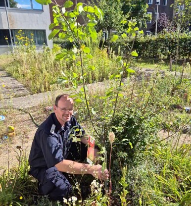 Wir fanden diese Idee super und haben uns dann heute mit der Frau Hoffmann und der Frau Trojan vom Sana Hanse-Klinikum Wismar getroffen. Dort hat es sich unser Wehrführer Stephan Hoffmann nicht nehmen lassen, eigenhändig diesen Apfelbaum (Sorte Elster) einzupflanzen.